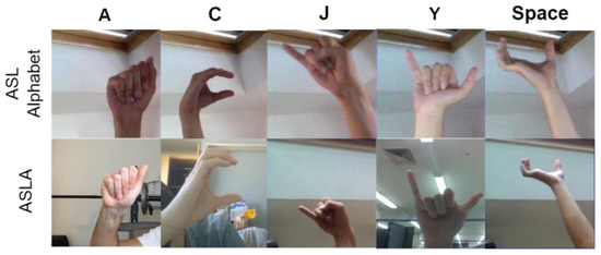 This paper uses two datasets, the ASL Alphabet [33] and ASLA (American Sign Language Alphabet) [34]. The ASL Alphabet dataset includes 29 classes, comprising 26 alphabetic characters A–Z and three other characters: space, delete, and nothing. Each class has 3000 images, each of which is 200 × 200 pixels in size. The ASLA dataset is similar to the ASL Alphabet except for the backgrounds, as shown in Figure 1. Each class has 7000 images, each of which is 400 × 400 pixels. The two datasets are split into 85% training images and 15% testing data.