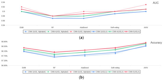 To obtain the best model in the feature extraction step, three types of multiple deep CNNs were designed: CNN-3, CNN-4, and CNN-5. CNN-3 uses M-LeNet, M-AlexNet, and M-GoogleNet; CNN-4 adds M-VGGNet to CNN-3; and CNN-5 adds M-ResNet to CNN-4. Figure 6 shows the performance of the ARS-MA models with the three types of CNNs. It shows that increasing the diversity of the higher-depth CNN models (M-GoogleNet, M-VGGNet, and M-ResNet) in the feature extraction step improves recognition accuracy. The accuracies and AUC values of the five classifiers increase as the number of M-CNNs increases, as shown in Figure 6a,b. CNN-5 with the AWV algorithm performed better than other types of CNN models on both datasets.