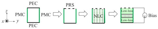 From left to right, an air-filled PEC/PMC waveguide, which evolves first in an open leaky waveguide where the PEC top plate is replaced by a PRS, is then entirely filled with an NLC to allow for dynamic beamsteering and, finally, is only partially filled with an NLC material to compensate for losses.
