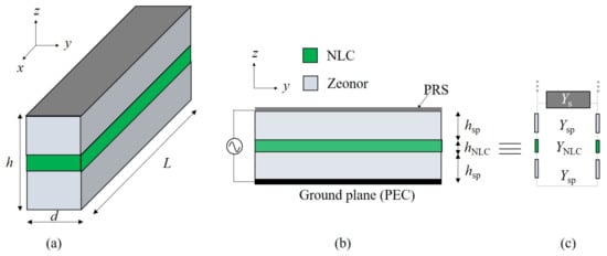 Here, we provide some brief considerations regarding the LC biasing scheme and characteristics. As shown in Figure 2, the LC bias voltage is applied along the z-axis, i.e., between the PRS and the bottom PEC ground plane. At the lateral walls, the metallic patch array of the PMC will behave as a uniform conducting surface at the LC bias frequency, which is typically between 1 and 10 kHz. Hence, the PMC walls have to be electrically disconnected from the PRS/ground electrodes in order to avoid short-circuiting by introducing a small lateral gap, e.g., by slightly reducing the width d.