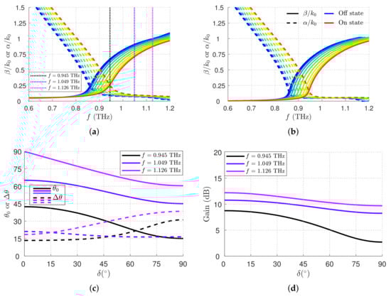 This effect is also appreciable from the dispersion curves depicted in Figure 3a,b, where it is seen that the normalized phase (in solid lines) and attenuation constant (in dashed lines) dispersion curves cross each other (resonant condition for having broadside beams [,]) in the range of 0.85–0.95 THz. In Figure 3b, the same results of Figure 3a are obtained for the lossless version of the optimized structure in order to obtain and , which are essential to compute the radiation efficiency (see Equation (4)) and, in turn, the gain.