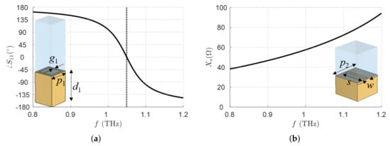 The sheet impedance is then extracted by means of conventional Floquet–Bloch full-wave simulations of such a unit cell for different choices of design parameters. After a parametric analysis, we obtained the desired sheet impedance value (see Figure 4b) for the following design parameters: the period , the slot length , and the slot width . In the simulation of the unit-cell, a substrate of Zeonor of thickness is considered so that the extracted considers the inhomogeneous character of the materials at the interface.