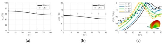 Full-wave results are shown for both the radiation efficiency and peak gain in Figure 5a,b, respectively, where they are reported as black circles and compared with the analytical results (solid black lines), showing satisfactory agreement. Analytical results were obtained using Equations (3) and (4) for the efficiency and directivity, respectively, with the numerical values of and obtained from the dispersion analysis as described in Section 3.1.