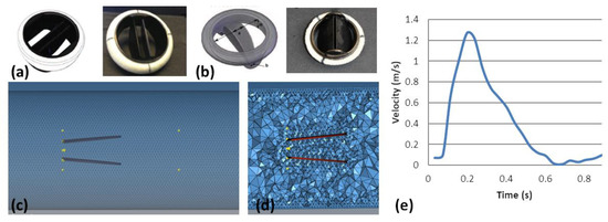 Parametric numerical simulation. BMHV designs: OnX (a) and St Jude Medical (b), Numerical simulation settings: BMHV in the tube (c) and details of computational mesh (d), and inflow velocity curve (e).