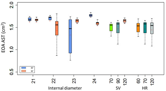 Numerical results—Boxplot representation of the influence of prosthesis design and hemodynamics on the EOA computation. Internal diameter influence 21 to 24 mm, stroke volume: SV of 70, 90, and 120 mL, and HR: Heart Rate: 60 to 120 bpm.