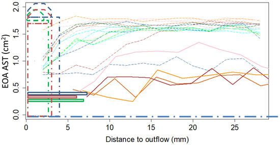 Computation of the EOAAST was performed along planes perpendicular to the flow from the outflow of the BMHV to 28 mm away from the outflow every 2 mm. Automatic detection of the EOAAST was performed using thresholding (highest 50th percentile of the AST distribution—see Figure 3).