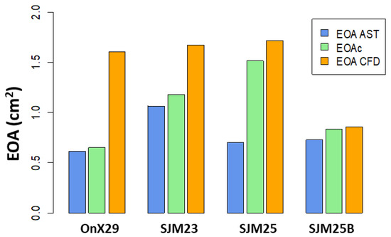 Comparisons of EOA for the four models of BMHV using MRI data (EOAAST—blue and EOAC—green) and comparison with the numerical results EOA CFD (orange).