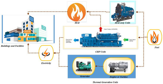 The key players in the ED in efforts to supply the electricity and heat loads in the facilities and buildings are depicted in Figure 1. The core purpose of the ED combining CHPUs would be to identify the economic potential rate for heat generated by HOUs, power generated by POUs, and both power and heat generated by CHPUs, such that fuel costs are maintained to a minimum while heat and power needs and restrictions are met [34]. Thus, the generation cost objective (F) may be stated as: