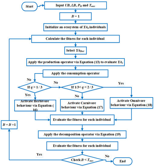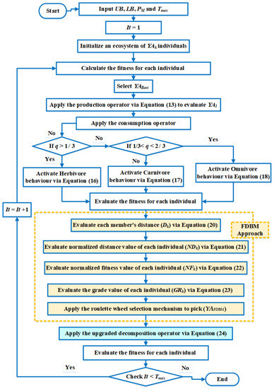 The MAEA process is depicted in Figure 3. It starts by randomly forming a population. The first seeking individuals adjust their locations according to Equation (13) with each repeat, but the subsequent participants have the same opportunity to alter their placements by selecting Herbivore according to Equation (16), Carnivore according to Equation (17), or Omnivore according to Equation (18). Adjustment may be allowable when a participant obtains a greater fitness trait. The FDBM is then triggered to select an alternative by including a high probability of receiving a good grade. To accomplish this, each member’s distance from the optimum choice is calculated as shown in Equation (20). The normalized objective functions and distance scores of the prospects are therefore assessed utilizing Equations (21) and (22), whereas the rating grades of the solutions are computed in the second step of the FDBM approach as shown in Equation (23). Equation (24) would then be used to change the placement of each component. Participants might be created at random in the seeking space whenever there is gap far from the upper or lower borders throughout the upgrade sequence. All changes are made continually until the AEA procedure is completed, by the inclusion of a termination criterion. Eventually, the best candidate is chosen.