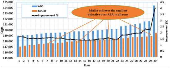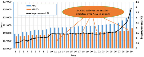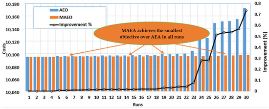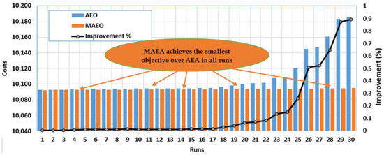 In addition, Figure 7 displays the obtained costs for all simulated runs of the proposed MAEA and the basic AEA of Case 2. As shown, the superior performance of the proposed MAEA is declared over the basic AEA in all simulated runs. The improvement percentage ranges from the very small value of 0.0009% to 0.73%.