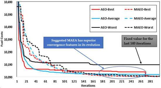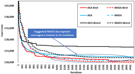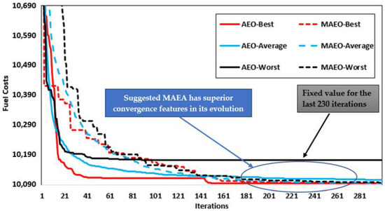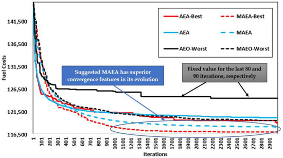 In addition, comparisons are made with the results of powerful optimization algorithms used in solving ED problems in the literature. For this purpose, Table 5 displays the comparative assessment of the AEA and the proposed MAEA with reported algorithms of TVAC-PSO [38], IGA [39], ECSA [40], PSO [41], TVAC-PSO [41], LCA [42], CPSO [43], WVO [44], WVO-PSO [44], RCGA [45], BCO [45], and DE [43,46]. As shown, the suggested MAEA provides better-performing features compared with the others.