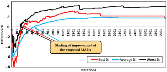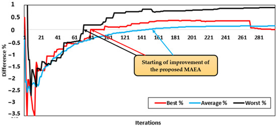 In addition, Figure 5 displays the convergence rates of the proposed MAEA and the basic AEA related to the best run, worst run, and the average of all simulated runs. As demonstrated, the suggested MAEA has superior convergence features in its evolution in terms of lowering fuel expenditures throughout the duration of iterations. Despite achieving lower fitness values in the first 130 iterations, the AEA remained in a local optimal zone, particularly for its best run. The difference between the best run, worst run, and the average of all runs of the MAEA and AEA of Case 1 is shown in Figure 6, confirming the considerable improvement of the proposed MAEA after about 47%, 7%, and 20% of the total number of iterations for the average, best, and worst situations.