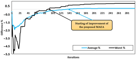 In addition, Figure 8 displays the convergence rates of the proposed MAEA and the basic AEA related to the best run, worst run, and the average of all simulated runs. As demonstrated, the suggested MAEA has superior convergence features in its evolution in terms of lowering fuel expenditures throughout the duration of iterations. Despite achieving lower fitness values in the first 140 iterations, the AEA remained in a local optimal zone, particularly for its best run. Focusing on the average and worst performance of the AEA and MAEA, the difference between the obtained convergence of the MAEA and AEA of Case 2 is shown in Figure 9, confirming the considerable improvement of the proposed MAEA after about 43% and 28% of the total number of iterations for the average and worst situations.