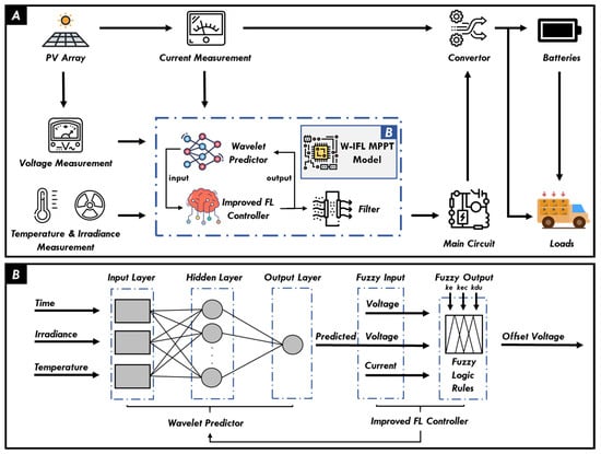 (A) The schema of the proposed MPP control; (B) The framework of the W-IFL MPPT model (Icon Source: https://www.flaticon.com/ (accessed on 25 October 2022)).