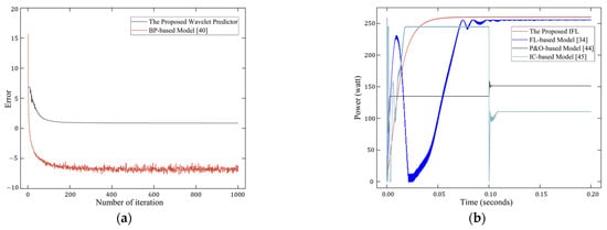 The comparison between different MPPT methods: (a) the prediction error of the iteration between two ANN models; (b) the power output of different MPP control models.