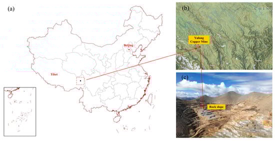 Yulong Copper Mine in Tibet, China. (a) Tibet Autonomous Region in Southwest China; (b) Satellite imagery of Yulong copper mine; (c) Rock slope in Yulong copper mine.