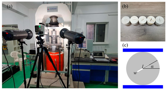 Design drawing of experimental device and specimen. (a) Photograph of experimental device; (b) Test specimens; (c) l is the ice-filled crack length, α is the ice-filled crack angle, and w is the ice-filled crack width.