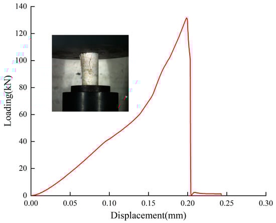 The compressive and tensile strengths of intact frozen rock under natural water were measured. The uniaxial compressive force–displacement curve of the frozen rock specimen fell sharply when it increased to 131.02 kN (Figure 3). When the tensile strength of the intact specimen reached the peak value of 8.88 kN, the stress curve fell quickly (Figure 4).
