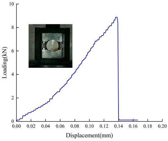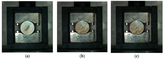In order to prevent moisture migration during freezing and ensure uniform moisture in the specimen, the prepared specimens were first placed in a constant low temperature environment of −20 °C for rapid freezing, and the freezing time was 48 h. Subsequently, a uniaxial compression testing machine was used as the power device to carry out the Brazilian splitting test on the frozen rock specimens (Figure 2). The constant deformation rate (0.001 mm/s) was loaded until the specimen was split. The tensile strength of the specimen was calculated using the formula proposed by Shloido [31]: