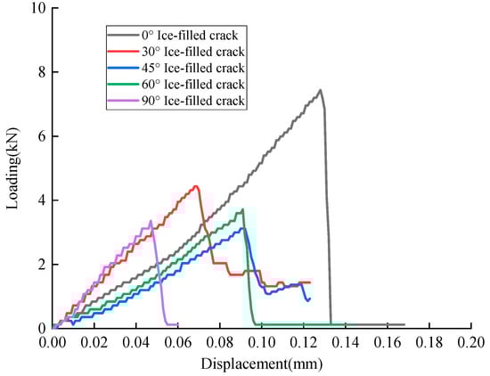 Figure 5 shows the Brazilian splitting force–displacement curve of frozen rock with different ice-filled crack angles. The study found that all the frozen rock specimens showed typical brittle failure characteristics. The tensile strength of the frozen rock specimens decreased gradually and then increased with the increase in the ice-filled crack angles. The tensile strength fell quickly after the peak, and the specimens fractured after producing a small displacement.