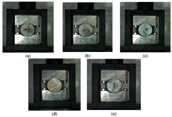 Figure 6 and Figure 7 show the splitting failure process of frozen rock specimens containing different ice-filled crack angles. The splitting failure is caused by the damage of ice during loading, the wing crack penetration of the ice-filled crack tip and the extension of the far-field crack. In the process of splitting, the ice-filled crack incurs damage first, and then the wing crack at the tip extends to the top and bottom of the specimen, and the macroscopic crack is gradually formed. When the ice-filled crack angle α is 0°, the ice-filled crack is perpendicular to the loading direction. The wing crack of the ice-filled crack tip cannot penetrate through the whole specimen along the ice-filled crack, and the tensile strength of the specimen is relatively high. When the ice-filled crack angle α > 0°, the ice crack’s force bearing and transmission during loading gradually decrease with the increase in the ice-filled crack angle. Crack formation is hindered by the ice-filled crack. As the ice-filled crack angle α increases, the crack evolution is less hindered. As the angle between the ice-filled crack and the loading direction gradually decreases, the crack and the ice-filled crack are quickly connected, eventually leading to specimen fracture. When the ice-filled crack angle α is 90°, the ice-filled crack is parallel to the loading direction, and the fissure ice effect is minimized.