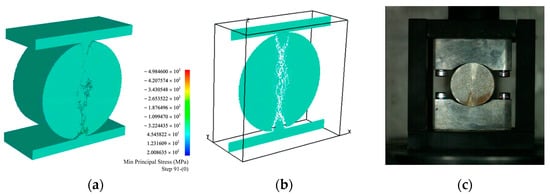 Numerical simulation results of Brazilian splitting of intact frozen rock: (a) minimum principal stress, (b) model slice, (c) fracture mode.