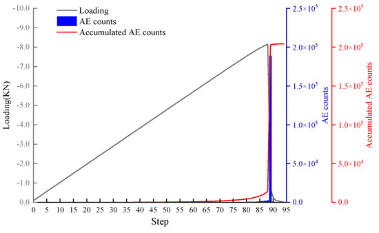 Figure 8 shows the numerical simulation results of the Brazilian splitting of intact frozen rock. Compared with the experimental results, the frozen rock fracture mode was similar, and macroscopic cracks were formed in the loading direction. The intact frozen rock specimen showed a typical brittle failure form. AE events increased sharply before macroscopic cracks occurred. The frozen rock specimen fractured instantly and released a large amount of energy (Figure 9). The load capacity of the intact frozen rock specimen was 8.15 kN in the numerical simulation and 8.88 kN in the experiment, which were similar to each other.