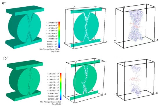 Figure 10 shows the numerical simulation results of the Brazilian splitting of frozen rock with different ice-filled crack angles. Red and blue circles in the AE distribution indicate the shear and tensile failure of the element. Compared with the experimental results (Figure 6), the splitting fracture modes of the frozen rock model were similar. The ice in the crack supported and transferred some force during the loading. However, the ice strength was lower than the rock strength, which induced the stress concentration at the ice-filled crack. When loaded to a certain extent, wing cracks occurred at the tip and penetrated through the whole model.