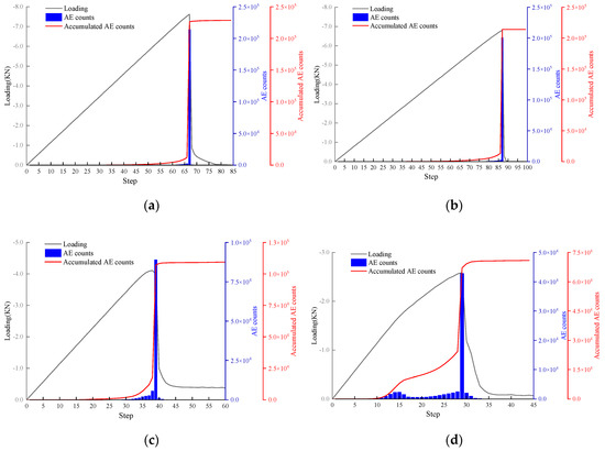 Figure 11 shows the relationship curve between the load, AE counts and accumulated AE counts for frozen rock with different ice-filled crack angles. The peak load of 0° ice-filled crack frozen rock was 7.62 kN, and splitting failure occurred at step 67. The peak load of 15° ice-filled crack frozen rock was 6.81 kN, and splitting failure occurred in step 87. The peak load of 30° ice-filled crack frozen rock was 4.11 kN, and splitting failure occurred at step 38. The peak load of the 45° fractured frozen rock specimen was 2.59 kN, and splitting failure occurred in step 29.