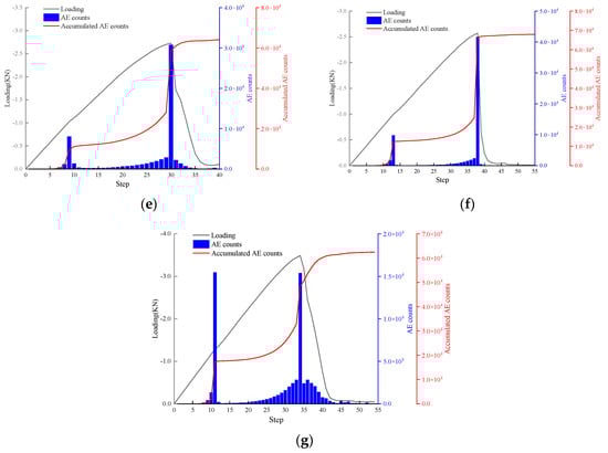 The relationship curve between load, AE counts and accumulated AE counts for frozen rock with different ice-filled crack angles: (a) 0°, (b) 15°, (c) 30°, (d) 45°, (e) 60°, (f) 75°, (g) 90°.