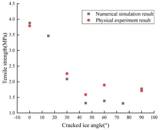 Figure 12 shows that the numerical simulation results are close to the experimental results by comparing the tensile strength of frozen rock with different ice-filled angles. The tensile strength of the specimens decreased gradually and then increased with the increase in the angle of the ice-filled crack. By comparing the tensile strength and fracture mode of the frozen rock with the experimental results, it proves that RFPA3D is feasible for simulating the splitting process of frozen rock mass.