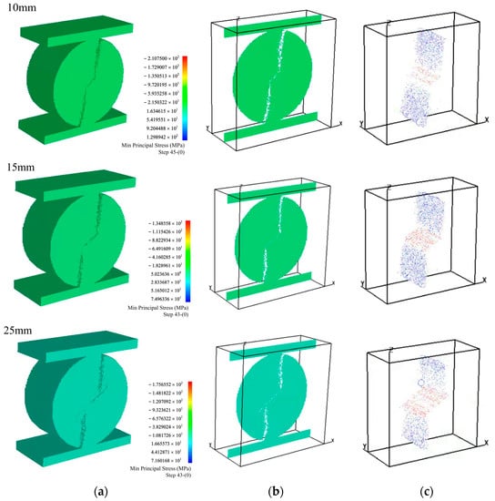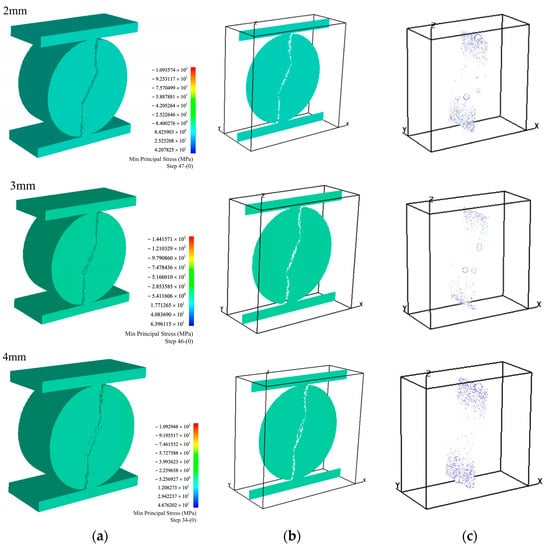 Brazilian splitting fracture mode of frozen rock with ice-filled cracks of different widths. (a) Minimum principal stress, (b) model slice, (c) AE.