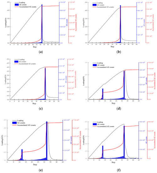 The relationship curve between load, AE counts and accumulated AE counts for ice-filled cracks of different lengths and widths of frozen rock. (a) l = 10 mm, (b) l = 15 mm, (c) l = 25 mm, (d) w = 2 mm, (e) w = 3 mm, (f) w = 4 mm.