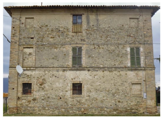 The analyzed building was constructed around the 1600s in Perugia, and it is characterized by a rectangular plan with dimensions 20.65 m × 13.15 m (Figure 1). The construction presents three floors above ground and is made of uncoursed squared rubble masonry (Figure 2) whose mechanical properties, evaluated according to [25,26], are summarized in Table 1, where γ is the unit weight, E is Young’s modulus, G is the shear modulus, fm is the mean compressive strength and τ0 is the mean shear strength. The masonry walls of the building are characterized by a thickness equal to 45 cm.
