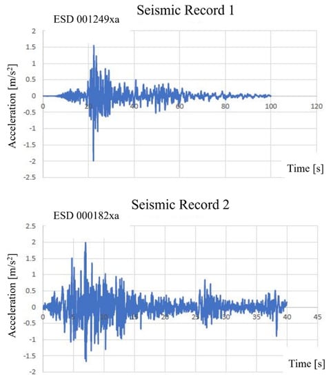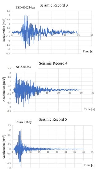 A non-linear time history analysis considering Rayleigh damping has been performed using the seven spectrum-compatible accelerograms reported in Figure 16, obtained using REXEL software [35] by considering the site seismic parameters listed in Table 2.