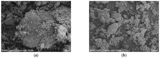 The unmodified (a) and modified (b) manganese sand were scanned with a scanning electron microscope. From Figure 1b, it can be seen that the manganese sand modified by potassium permanganate had a loose cluster distribution, and the roughness of the surface increased. There were many different sizes of pores on the surface of manganese sand, which may be one of the reasons for the improvement in its adsorption performance.