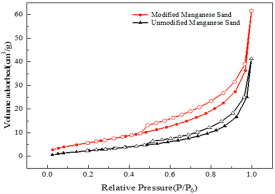 The adsorption volume of manganese sand increased with the increase in relative pressure. When the relative pressure was about 0.5 in Figure 2, the curve was divided into two smooth curves. The hysteresis loop occurred at high pressure, and capillary condensation occurred. According to the figure, the nitrogen adsorption–desorption isotherms of manganese sand and modified manganese sand belonged to type IV isotherms in the BDDT classification system. The adsorption–desorption curve revealed an obvious hysteresis phenomenon, which was the result of nitrogen capillary condensation in the mesopore. The adsorption effect of the modified manganese sand was improved, which showed that the pore expanded after being corroded by potassium permanganate.