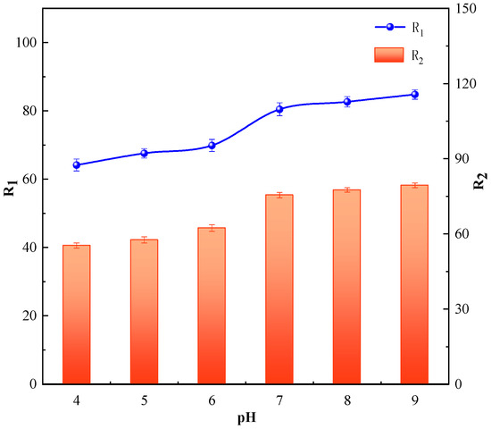 Effect of pH on the iron and manganese ions’ removal. R1 is the iron ion removal rate; R2 is the manganese ion removal rate.