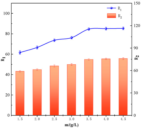 Effect of manganese sand dosage on the iron and manganese ion removal. R1 is the iron ion removal rate; R2 is the manganese ion removal rate.