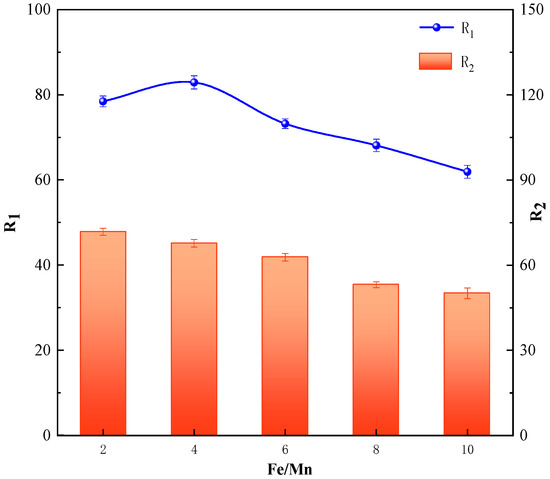 Effect of the initial concentration ratio of iron and manganese ions on the iron and manganese ions’ removal. R1 is the iron ion removal rate; R2 is the manganese ion removal rate.