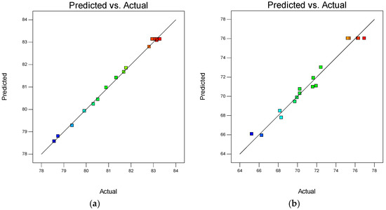 Figure 6 illustrates the correlation between the predicted value and the actual value of the removal efficiency in the response surface model. The experimental data points in the figure were more distributed on the straight line or on both sides of the straight line, indicating a good fit of the model. The summary of the fitted output report showed that the quadratic response model was suitable for explaining the relationship between the pollutant variables, so it could be used to analyze and optimize the effect of iron and manganese ions in water on the adsorption system.