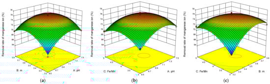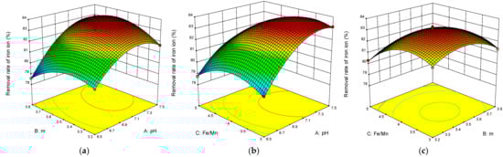 It can be seen from Figure 7a–c that when the pH was 7.1–7.3, the dosage of manganese sand was 3.4–3.6 g/L; that is, the initial concentration ratio of iron and manganese ions was between 3.5 and 4, the 3D surface had the deepest chromaticity, and the iron ion removal effect was better. It can be seen from the figure that the removal rate of iron ions could be significantly improved by increasing pH, which indicated that the change in pH significantly affected the whole adsorption system during the process of the adsorption of iron ions by manganese sand. The figure shows that with the increase in pH, the dosage of manganese sand, or the concentration of iron and manganese ions, the degradation rate of iron ions first increased and then decreased. Therefore, there was an optimal matching value between the different influencing factors, and appropriate experimental conditions can maximize the economic benefits of the model and effectively improve the iron ion removal rate.