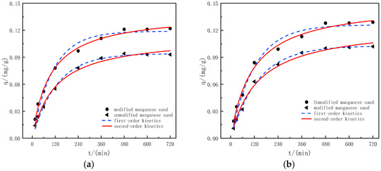 The quasi-primary and quasi-secondary kinetic fitting parameters are shown in Table 5 and Table 6. In the adsorption of iron and manganese ions by the unmodified manganese sand and modified manganese sand, the fitting regression coefficients of the quasi-first-order kinetic model were less than those of the quasi-second-order kinetic model, so it can be described by the quasi-second-order kinetic model. Compared with the unmodified manganese sand, the theoretical adsorption capacity of the modified manganese sand was improved. This was because the specific surface area of the modified manganese sand increased, and the adsorption point increased, which was conducive to increasing the reaction residence time of the adsorbent and the adsorbate, and at the same time, increasing the equilibrium adsorption capacity.