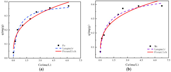 Adsorption isotherm models of iron (a) and manganese (b) ions.