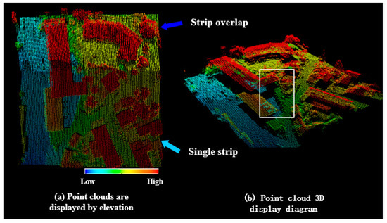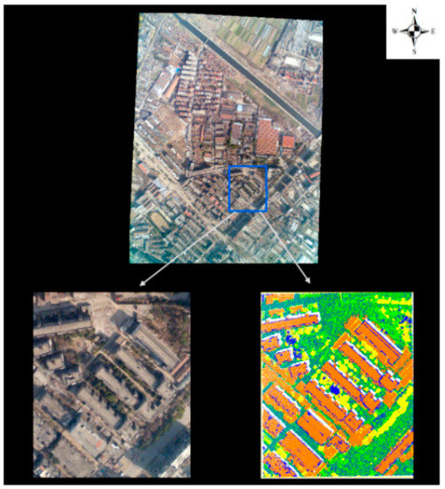 In order to improve the robustness and generalization of the network using another data check, we took test data from Sha City in Hubei Province, which contained 1,954,659 laser points in total. The X-axis span was 904.55 m, and the Y-axis span was 789.47 m. The relative altitude of the aerial images, which were obtained with an RCD-105 35 mm focal length camera, was 1100 m, and the point-cloud density was 1.34 pts/m2, as shown in Figure 4. Raw data include the XYZ information of the point cloud. The original point cloud data and remote sensing images are fused to obtain the point cloud data with RGB information. We used CloudCompare (http://www.cloudcompare.org/, accessed on 12 February 2020) tools to carefully label datasets to facilitate precision in subsequent comparisons.