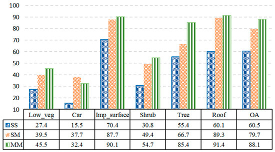 As can be seen from Figure 5, the proposed multiscale PointNet neighborhood algorithm (MM) had the highest overall classification accuracy and best classification effect. The overall accuracy was 88.1%. From the above quantitative evaluation results, fusion based on spectral information and covariance characteristics (SM) after all the features of the point cloud was shown to promote classification accuracy. The overall accuracy of SM was 19.2 percentage points higher than that of SS. After the fusion of spectral information and the covariance characteristics (MM) of the two scales, the accuracy was further improved by 8.4 percentage points compared with the single-scale SM. Among the classification categories, the accuracies of impervious ground, tree, and roof were improved by 19.7 percentage points, 30 percentage points, and 31.3 percentage points, respectively. It can be seen that the attribute information of multiscale and multi-neighborhood point clouds can be effectively enhanced, thus achieving a more accurate classification of various ground objects.