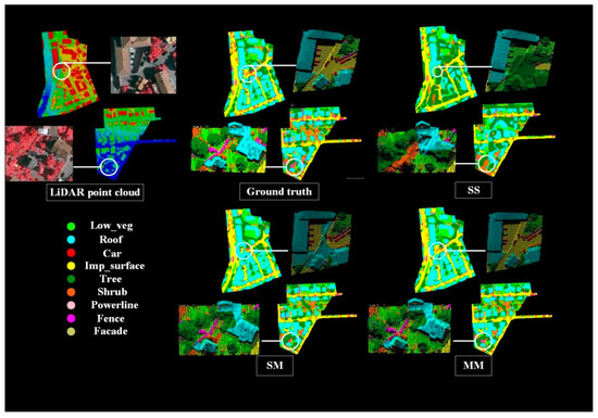 As can be seen from Figure 6, the classification results were consistent with the previous expectations. The multiscale and multi-feature MSMF-PointNet structure proposed in this paper had the best classification effect, as can also be clearly seen from the quantitative evaluation results in the table in Figure 5. On a whole, the final classification result of MM was almost the same as the real value, but the classification effect was especially prominent in the roof, tree, and impervious surface categories. As can be seen from the SS, features were classified as roof or tree much more accurately when added to the SM based on the local characteristics of the spherical neighborhood. Figure 6 shows the two places with ground features that the SS, according to the topography and elevation, simply classified as tree, roof, and shrub, while the SM refined the classification and was able to distinguish roof, tree, shrub, impervious surface, fence, and car.
