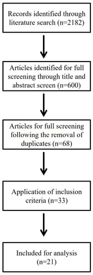 where Mpre is the mean value before the intervention, Mpost is the mean value after the intervention, n is the sample size of the group and Spre is the standard deviation (SD) preintervention. Threshold values for Cohen’s ES statistics were <0.2 (trivial), >0.2 (small), >0.6 (moderate) and >1.2 (large) [26]. For each study, the percentage change after the intervention was calculated. After checking the literature, 21 studies met the criteria (Figure 1). The analysis included 530 participants with an average age of 16.5 + 2.8 years.