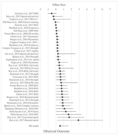 Finally, in the studies [47] where FIFA11+ was applied, no effect on the RSA was observed. It is well-known that this program (FIFA11+) was designed to prevent injuries to soccer players and not to affect physical abilities that are important for the RSA. The stimulus was not specific to the RSA, so the effectiveness was small.
