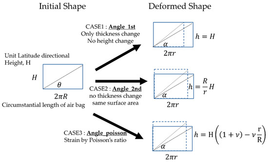 As shown in Figure 2, in a rectangle with the length in the same circumferential direction as the base and the length in the same longitudinal direction as the height, as the radius increases, the base increases. Regarding the change in thickness and height, in the first case, only the thickness changes and the height remains the same, and in the second case, there is no change in the thickness and the surface area of the airbag is the same before and after the deformation. Finally, the third case is a case in which the height and thickness are changed in proportion to the Poisson’s ratio due to the change in length in the circumferential direction. In each case, when the initial angle is and the initial radial position is , the angle at the final position can be expressed as , and can be expressed by Equations (1)–(3).